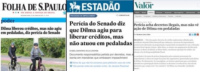 Brasil 247 - Folha, Estado e Valor atestaram, em suas manchetes, que a presidente Dilma Rousseff não teve qualquer responsabilidade sobre as chamadas "pedaladas fiscais", pretexto usado para o golpe parlamentar em curso no Brasil; depois disso, colunistas vinculados a esse processo afirmaram que a perícia do Senado não mudará um voto, porque o impeachment é um processo mais político do que jurídico; no entanto, esse argumento valia apenas (ainda que parcialmente) para admissibilidade do processo, e não para o julgamento final, presidido pelo ministro Ricardo Lewandowski, do STF; se isso não bastasse, a própria líder do governo interino, Rose de Freitas (PMDB-ES), confessou que ninguém leva a série das pedaladas; se as provas da defesa não forem suficientes para barrar o processo, Dilma levará o caso à Corte Interamericana de Direitos Humanos
