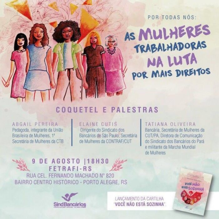 As mulheres têm sido cada vez mais protagonistas nas lutas por mais direitos sociais e trabalhistas e na defesa da democracia. Para fortalecer essa caminhada e dar visibilidade à luta por igualdade e respeito às mulheres, o Sindicato dos Bancários de Porto Alegre e Região lança, no dia 9 de agosto, às 18h30, a cartilha “Você não está sozinha!”. Esse documento foi construído pelo Coletivo de Mulheres Bancárias do SindBancários de Porto Alegre e Região.