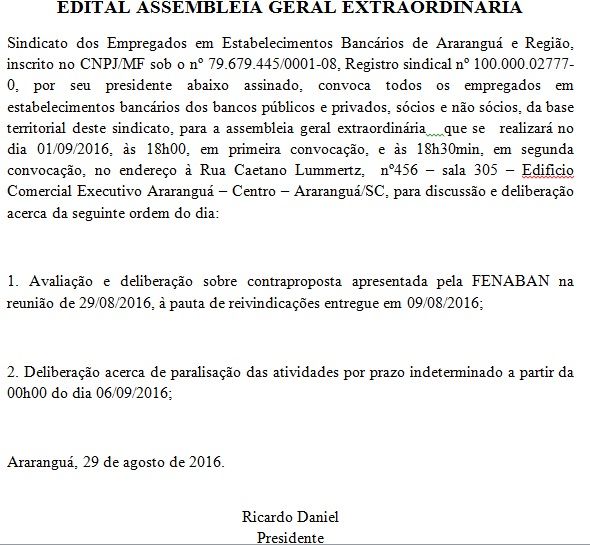 Sindicato dos Empregados em Estabelecimentos Bancários de Araranguá e Região, inscrito no CNPJ/MF sob o nº 79.679.445/0001-08, Registro sindical nº 100.000.02777-0, por seu presidente abaixo assinado, convoca todos os empregados em estabelecimentos bancários dos bancos públicos e privados, sócios e não sócios, da base territorial deste sindicato, para a assembleia geral extraordinária que se realizará no dia 01/09/2016, às 18h00, em primeira convocação, e às 18h30min, em segunda convocação, no endereço à Rua Caetano Lummertz, nº456 – sala 305 – Edificio Comercial Executivo Araranguá – Centro – Araranguá/SC, para discussão e deliberação acerca da seguinte ordem do dia: