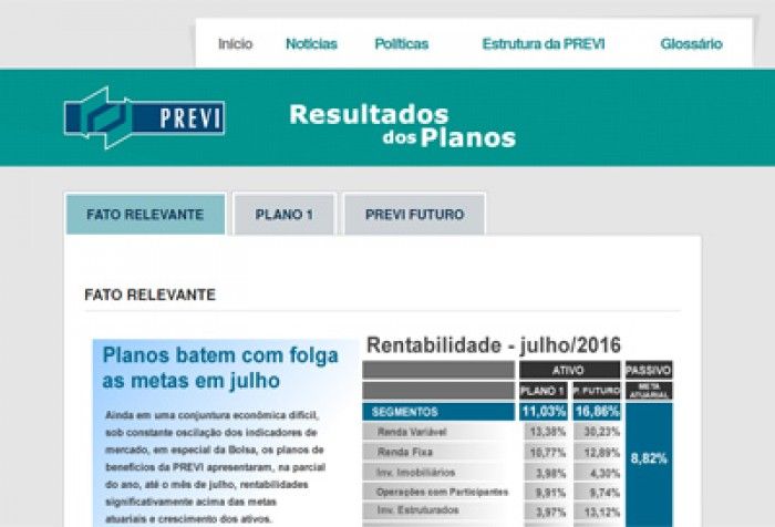 Os participantes e assistidos da Caixa de Previdência dos Funcionários do Banco do Brasil (Previ) têm à disposição uma nova ferramenta para obter informações rápidas e seguras do fundo de pensão, do Plano 1 e o Previ Futuro. Desde o final de agosto um hotsite (clique aqui) disponibiliza dados sobre a evolução financeira de cada uma das modalidades.