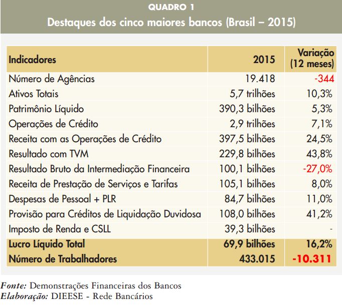 Em 2015, o lucro dos cinco maiores bancos (Itaú, BB, Caixa, Bradesco e Santander) do país foi de quase R$ 70 bilhões. Somente de julho de 2015 a julho deste ano, o lucro já ultrapassa R$ 54 bilhões. Ainda assim, demitiram mais de dez mil trabalhadores no ano passado e, neste ano, já são mais oito mil bancários desempregados.