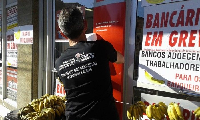 Bancários distribuíram 40 quilos de banana para as pessoas que circularem próximo ao Bradesco centro de Criciúma, nesta terça-feira (20). O protesto bem-humorado “Uma banana para os banqueiros” é mais um ato no cenário da greve dos bancários em Criciúma.