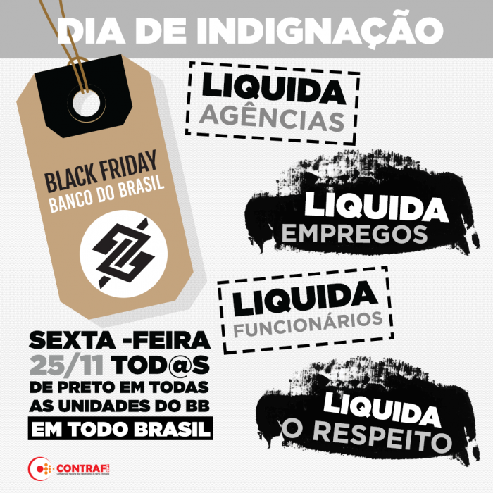 A Contraf-CUT convoca todos os funcionários do Banco do Brasil a aderirem a manifestação no dia da mobilização nacional, que será realizado nesta sexta-feira (25). A orientação é para todos irem trabalhar com roupas pretas, como forma de protesto e indignação contra a direção do BB pelo desrespeito aos funcionários ao comunicar o fechamento de agências e corte de cargos via imprensa e somente depois aos funcionários.