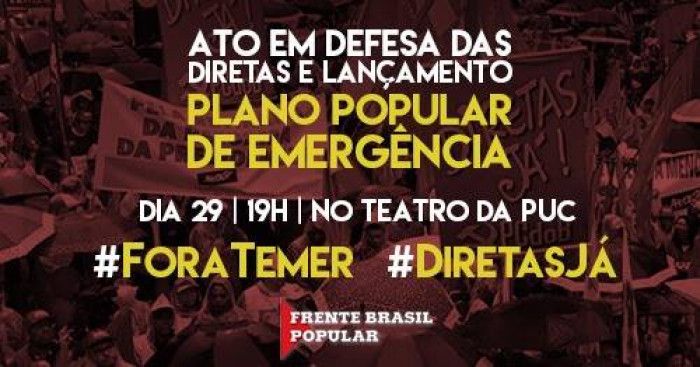 Movimentos sociais, entre os quais a Frente Brasil Popular e o Movimento dos Trabalhadores Rurais Sem Terra (MST), lançam na segunda-feira (29), em São Paulo, um plano popular para um governo de emergência, caso ocorram eleições diretas ainda este ano no país. A iniciativa surge com o agravamento da crise política, depois que o governo de Michel Temer foi denunciado por gravações do empresário Joesley Batista, da JBS, em conversa na qual endossa o pagamento de mesada ao ex-deputado Eduardo Cunha (PMDB) para que mantenha silêncio em relação aos desmandos de Brasília.