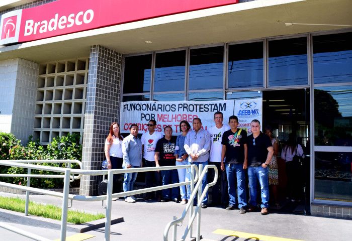 Nesta quinta-feira (03), a direção do Sindicato dos Bancários de Mato Grosso (Seeb/MT) realizou Ato de Protesto em frente ao Bradesco, Agência Prainha, Centro de Cuiabá, capital de Mato Grosso. Os bancários e bancárias reclamam sobre cobranças excessivas e enfrentam abuso de poder da gerência.