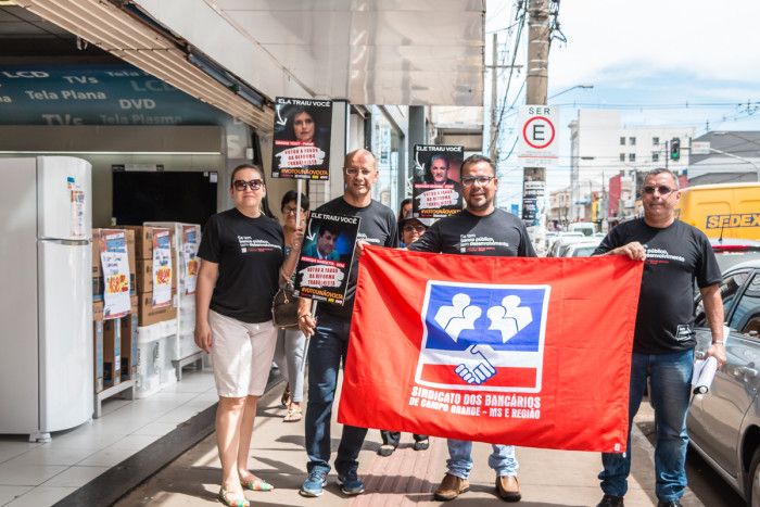 Com cartazes, os bancários também denunciaram os deputados federais e senadores que votaram contra o povo e aprovaram a reforma trabalhista.