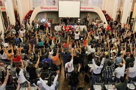 Os trabalhadores do Banrisul decidiram, na tarde desta terça-feira (7), em assembleia realizada no Clube do Comércio, em Porto Alegre, rejeitar a proposta da diretoria do banco, apresentada durante mesa de negociação pela manhã, e manter a greve por tempo indeterminado. O mesmo resultado ocorreu em assembleias realizadas em vários sindicatos no interior do Rio Grande do Sul, conforme levantamento preliminar da Fetrafi-RS.