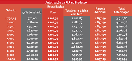 A regra básica da PLR corresponde a 54% do salário mais valor fixo de R$ 1.102,79, limitado a R$ 5.915,95 e ao teto de 12,8% do lucro líquido do banco no primeiro semestre de 2014, o que ocorrer primeiro.
