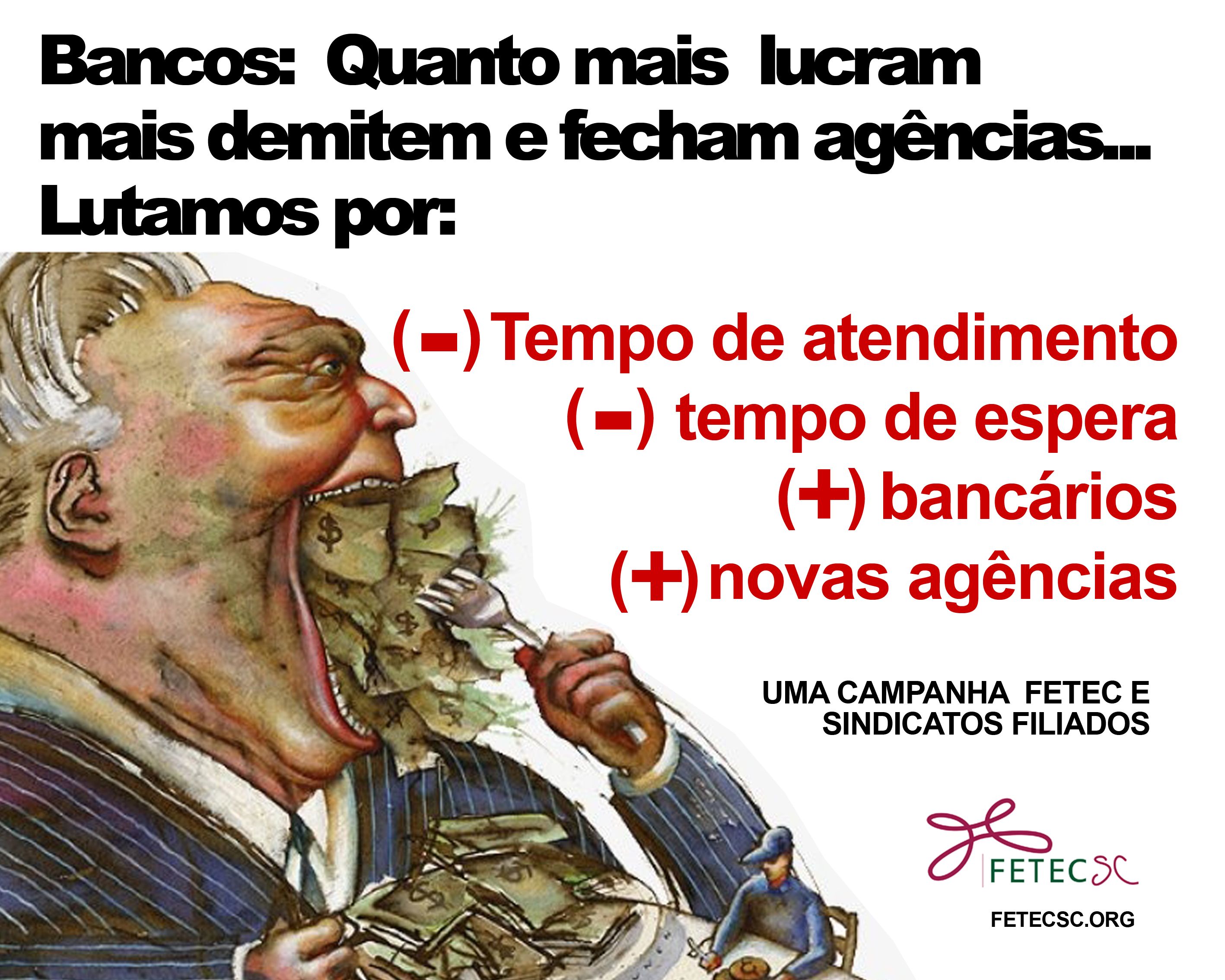 Após o Sindicato constatar redução de 40 trabalhadores em todos os bancos da região nos últimos 3 anos, as atividades externas expuseram a demora no atendimento ao público e a necessidade urgente de mais bancários para melhorar o ambiente de trabalho e atendimento à população, nossas reivindicações e o abaixo assinado, por clientes e usuários, foram entregues às administrações regionais dos bancos Bradesco, Caixa e Banco do Brasil. Bradesco e Caixa nos responderam dizendo que apenas mais um bancário será incorporado ao quadro de funcionários (agências de Araranguá), ficando muito aquém do necessário para resolver os problemas constatados em toda a base. Banco do Brasil não nos deu retorno até o momento. O Sindicato buscará alternativas para tentar resolver o problema.