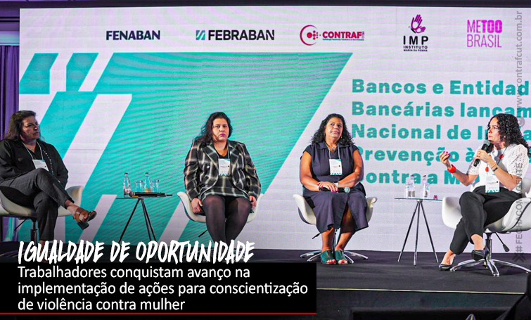 Na mesa “Iniciativas de negociação nacional do movimento sindical e os bancos para a sociedade, bancárias e bancários”, representantes das três organizações não governamentais (ONGs) Papo de Homem, Me Too Brasil e IMP Instituto Maria da Penha, apresentaram suas propostas de trabalho. As entidades foram contratadas pelos bancos para responder às demandas do movimento sindical, inseridas na Convenção Coletiva de Trabalho (CCT).
