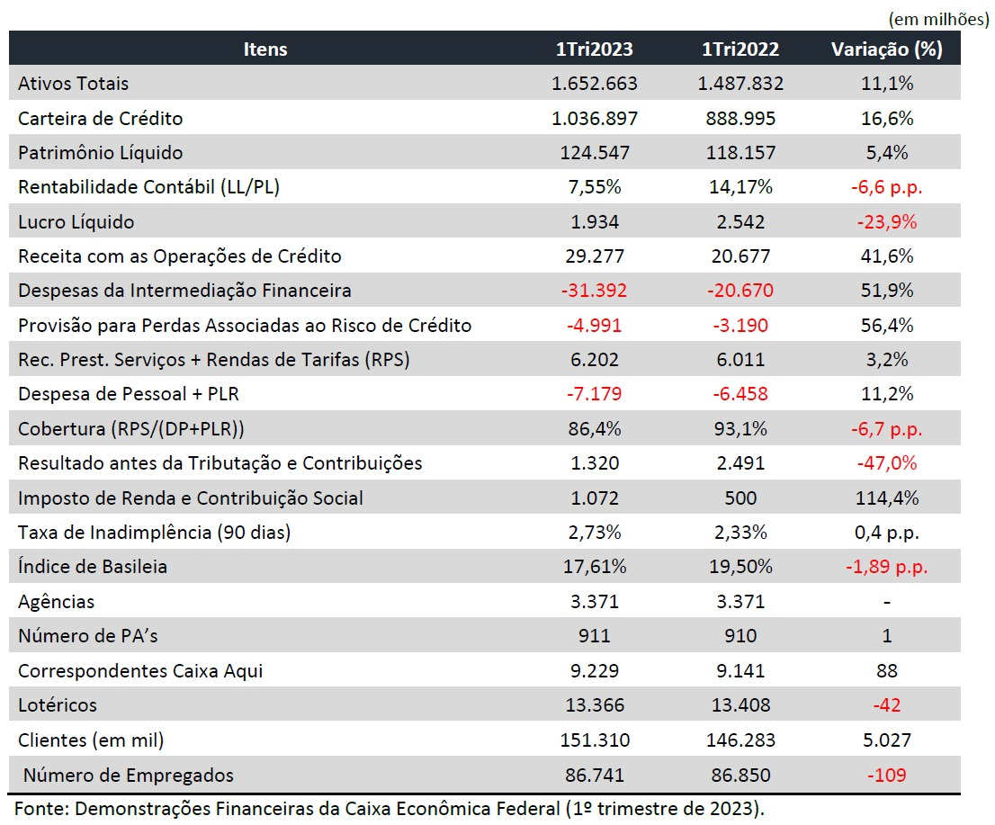 O Lucro Líquido da Caixa Econômica Federal foi de R$ 1,9 bilhão no 1º trimestre de 2023, com decréscimo de 23,9% em relação ao 1º trimestre de 2022 e de 11,1% em relação ao trimestre imediatamente anterior. A rentabilidade do banco sobre seu patrimônio líquido (ROE) ficou em 7,55%. Nos três primeiros meses do ano, a margem financeira Caixa cresceu 30,4%, em comparação ao mesmo período de 2022, atingindo R$ 13,9 bilhões. Por outro lado, houve elevação de 56,4% nas despesas de provisão para devedores duvidosos (PDD) e de 19,8% nas outras despesas administrativas.