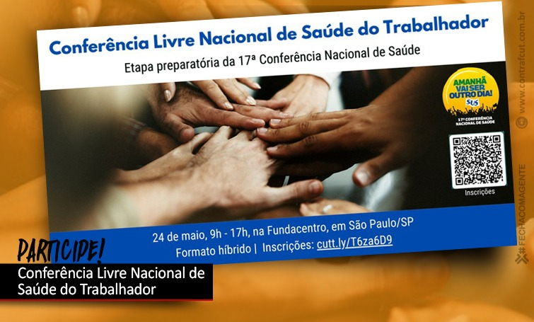 Acontecerá no dia 24 de maio, das 9h às 17h, na Fundacentro, em São Paulo, a Conferência Livre Nacional de Saúde do Trabalhador, etapa preparatória para a 17ª Conferência Nacional de Saúde. O evento será realizado em formato híbrido.