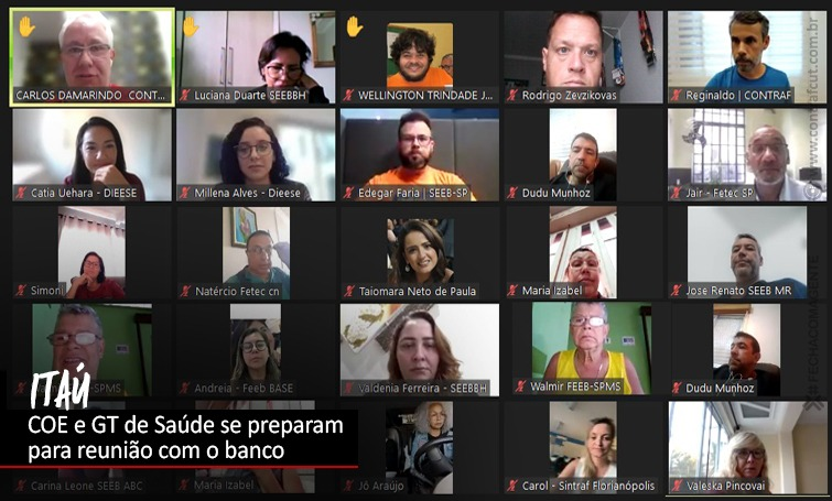 Os membros titulares da Comissão de Organização dos Funcionários (COE) e Grupo de Trabalho de Saúde (GT Saúde) do Banco Itaú-Unibanco se reuniu na tarde desta terça-feira (6), uma reunião on-line para se preparem para reunião com a direção do banco, no dia 14 de junho.