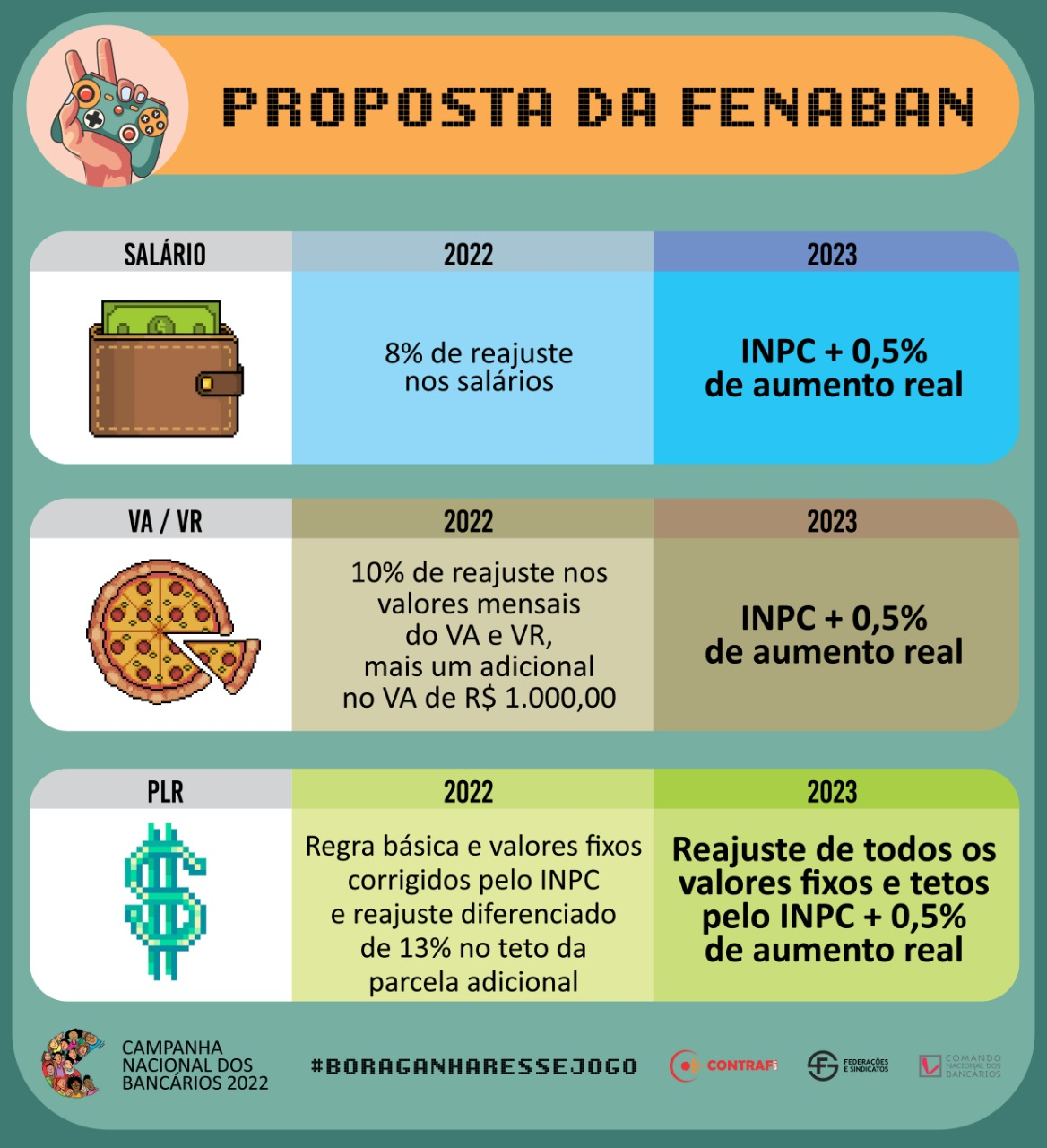 Além da manutenção de todos os direitos, as negociações realizadas pelo Comando Nacional dos Bancários levaram ao reajuste, para 2022, de 8% nos salários, aumento de 10% nos vales alimentação (VA) e refeição (VR), além de um adicional de R$ 1.000,00 em VA para compensar a alta inflação dos alimentos constada no período. Também foi conquistado reajuste de 13% para o teto da parcela adicional da Participação nos Lucros e Resultados (PLR) do ano passado.