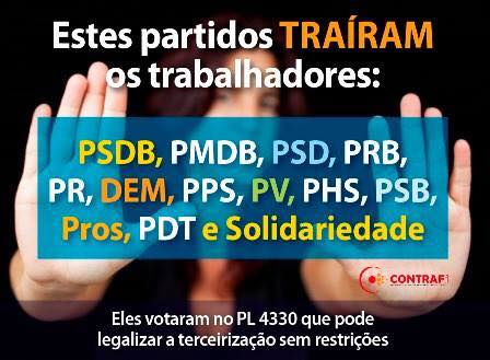 A CUT, a CTB e as principais sindicais brasileiras, aliadas a movimentos sociais como o MST (Movimento dos Trabalhadores Rurais Sem Terra), MTST (Movimento dos Trabalhadores Sem Teto) e Fora do Eixo-Mídia Ninja, estão convocando um dia nacional de paralisação na próxima quarta-feira (15), a fim de cobrar a retirada do PL 4330.
