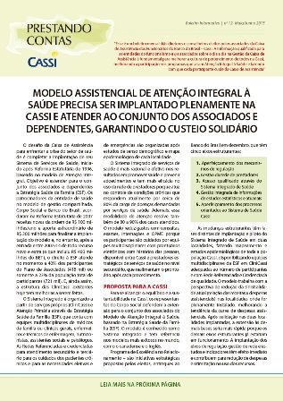 O modelo assistencial de atenção integral à saúde precisa ser implantado plenamente na Cassi (Caixa de Assistência dos Funcionários do Banco do Brasil) e atender ao conjunto dos associados e dependentes para garantir o custeio solidário. Esta é a manchete da 12º edição do boletim Prestando Contas Cassi, distribuído pelos dirigentes eleitos da Caixa de Assistência dos Funcionários do Banco do Brasil, a partir desta semana. A ideia é uma alternativa para o Caixa de Assistência enfrentar a crise no sistema de saúde brasileiro.