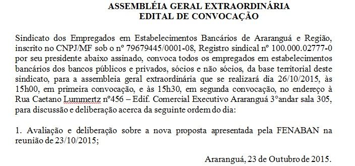 Os bancários realizam assembleia na segunda-feira, 26,às 15h00, em primeira convocação, e às 15h30, em segunda convocação, na sede do Sindicato dos Bancários, no endereço à Rua Caetano Lummertz nº456 – Edif. Comercial Executivo Araranguá 3°andar sala 305, para votação da proposta da Fenaban apresentada nos dias 23 e 24.